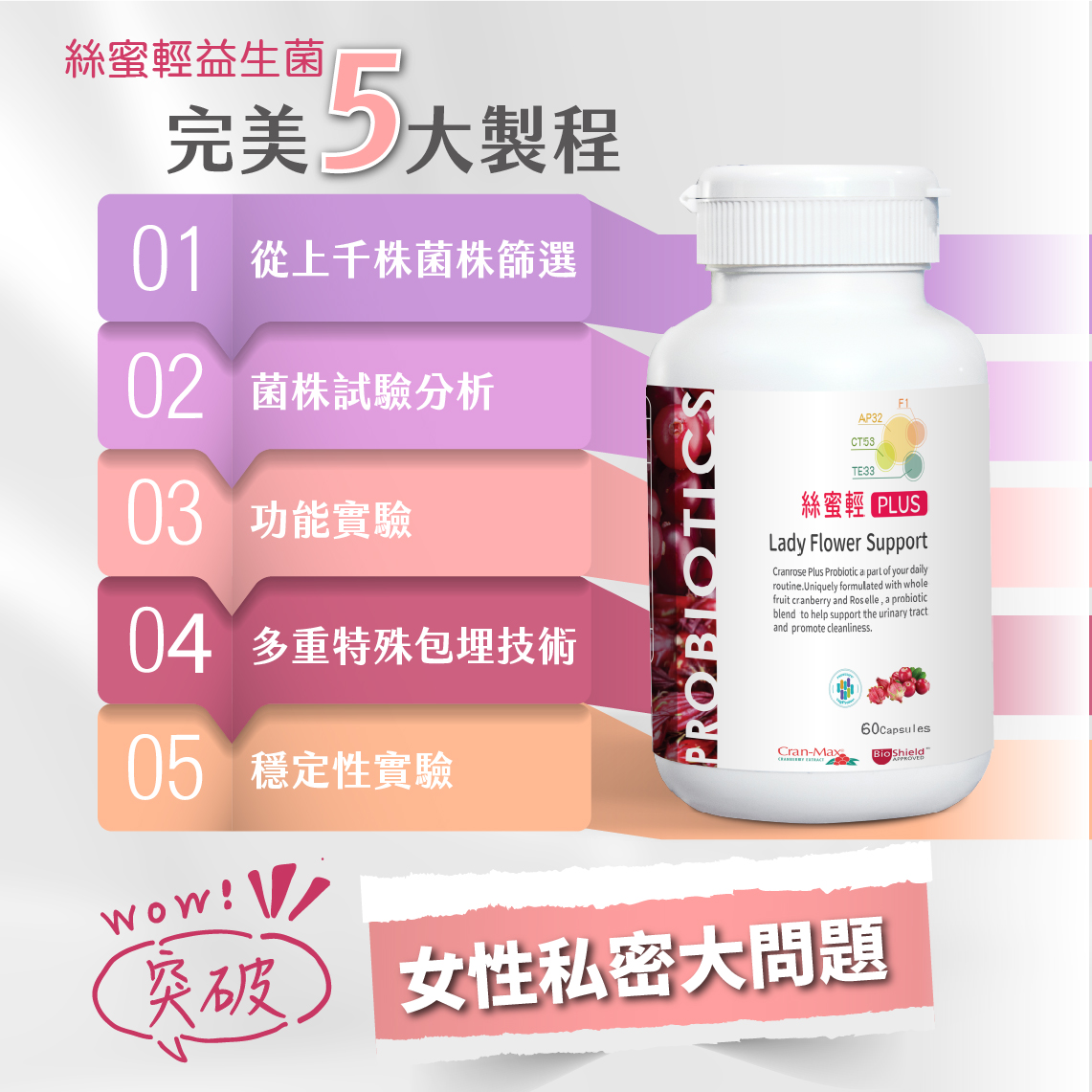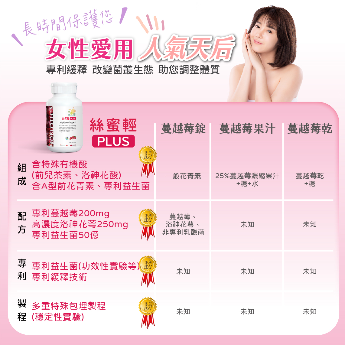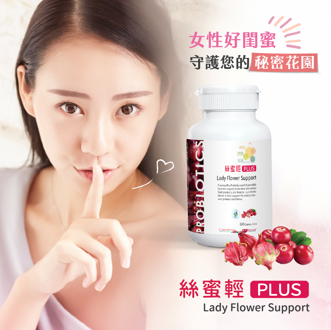 A:蔓越莓+洛神花+專利益生菌可以改變細菌叢生態、調整體質、保養私密健康,成分更完整,更全面。